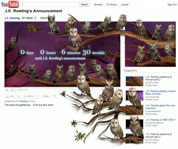 Le 31 mai, lancement sur Youtube de la chaîne JK Rowling Announces. Un décompte nous prévient d’une annonce imminente de JK Rowling, avec de plus en plus de chouettes en fur et à mesure que le temps passe.