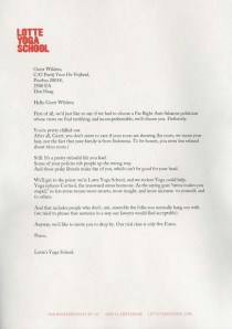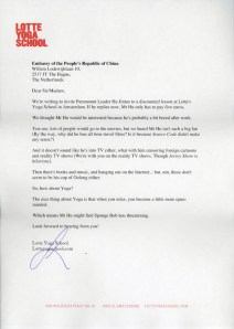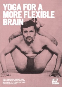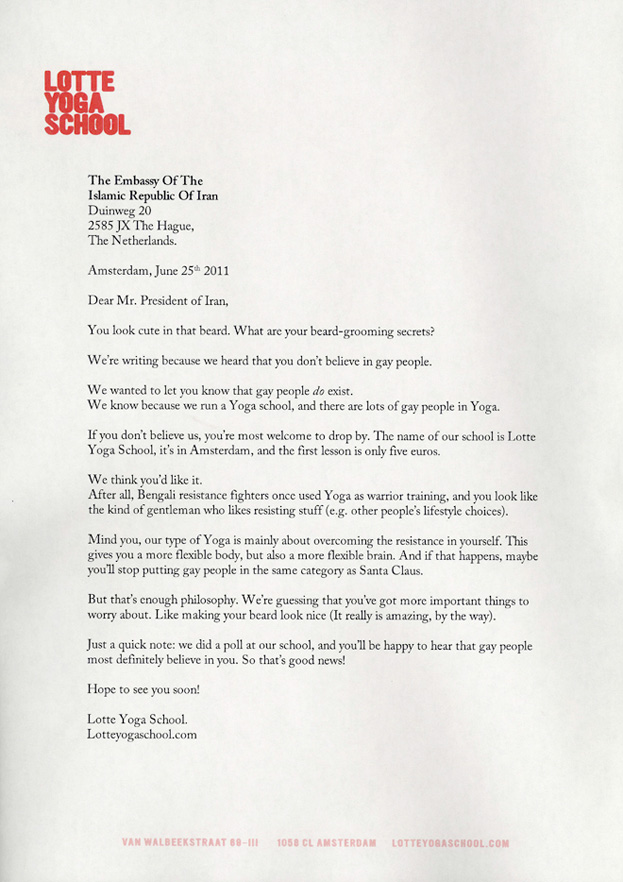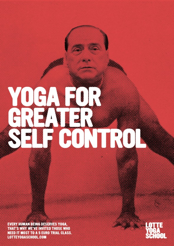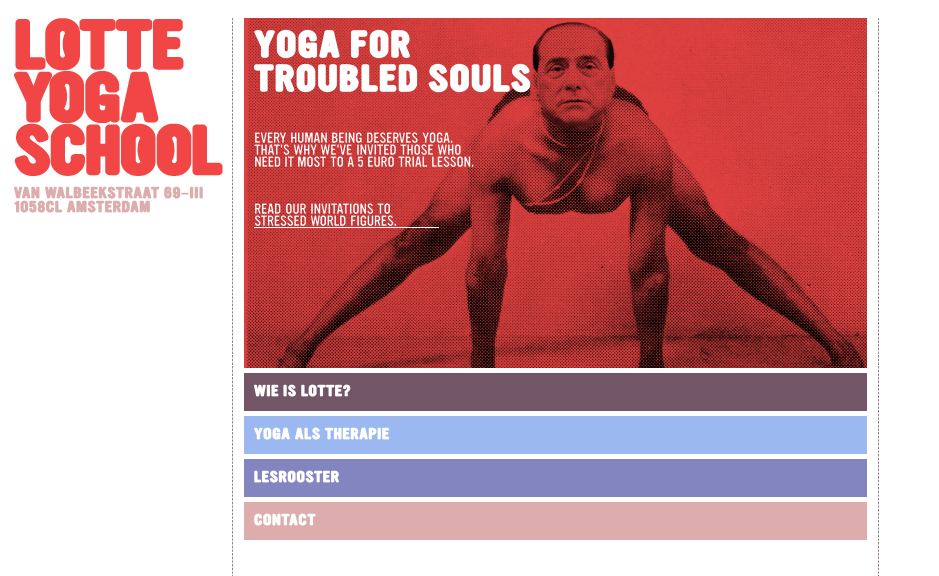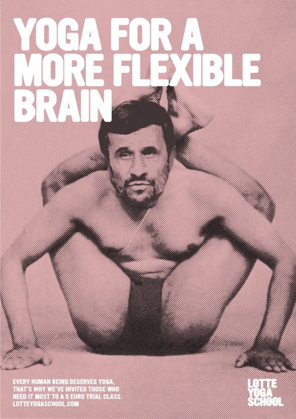 En mettant en scène Mahmoud Ahmadinejad, Geert Wilders et Silvio Berlusconi dans une campagne d’affichage pour la Lotte’s Yoga School d’Amsterdam, la démonstration de l’utilité du yoga est faite. Et pour aller jusqu’au bout de la démarche, des lettres invitant les principaux intéressés à participer à une séance d’essai ont été publiées.