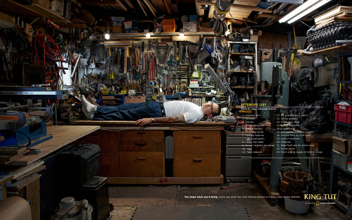 Vous avez déjà pensé à la liste des choses que vous voulez emmener pour votre vie après la mort ? C’est en tout cas le concept utilisé pour la campagne au sujet de la très fameuse exposition Toutânkhamon et l’âge d’or des pharaons (King Tut Exhibition) organisée par le National Geographic. Faisant référence aux 50 objets retrouvés dans la tombe du pharaon, la campagne s’amuse à imaginer ce qu’un bricoleur, un « reconstiteur » (nouveau mot pour qualifier ceux qui pratiquent avec ferveur des reconstitutions de l’époque médiévale) ou encore un théoricien de la conspiration peuvent emmener dans leur tombe.