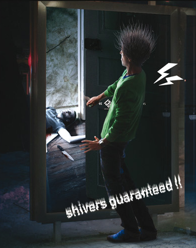 Frissons garantis pour 13ème rue dans les rues parisiennes. Une expérience à vivre sur les abribus Decaux : en tournant la manivelle, vos cheveux se hérissent sur vos têtes. Et cette réaction (provoquée, certes) est justifiée : l’affiche s’allume et l’on découvre un fantôme et un cadavre.