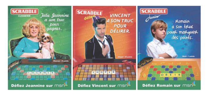 Mais la marque revient en France en cette fin d’année avec une campagne plus opérationnelle (l’image ne fait-elle plus vendre ?) : une campagne d’affichage avec Tatie Jeannine, Vincent le clubber, et Romain l’enfant espiègle qui nous invitent à jouer avec eux. Un dispositif online sur Msn proposant aux internautes de défier ces trois nouveaux personnages a été mis en place. Chaque semaine et jusqu’au 31 décembre 2011, vous avez ainsi la possibilité de tester vos talents de joueur et de gagner des cadeaux sur http://divertissements.fr.msn.com/scrabble/le-challenge.aspx