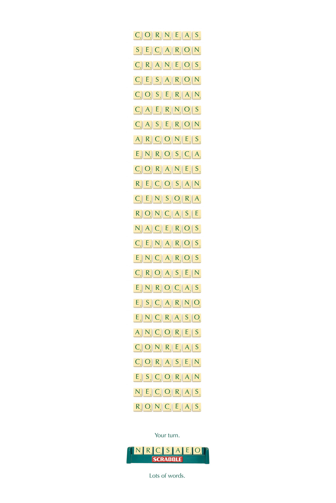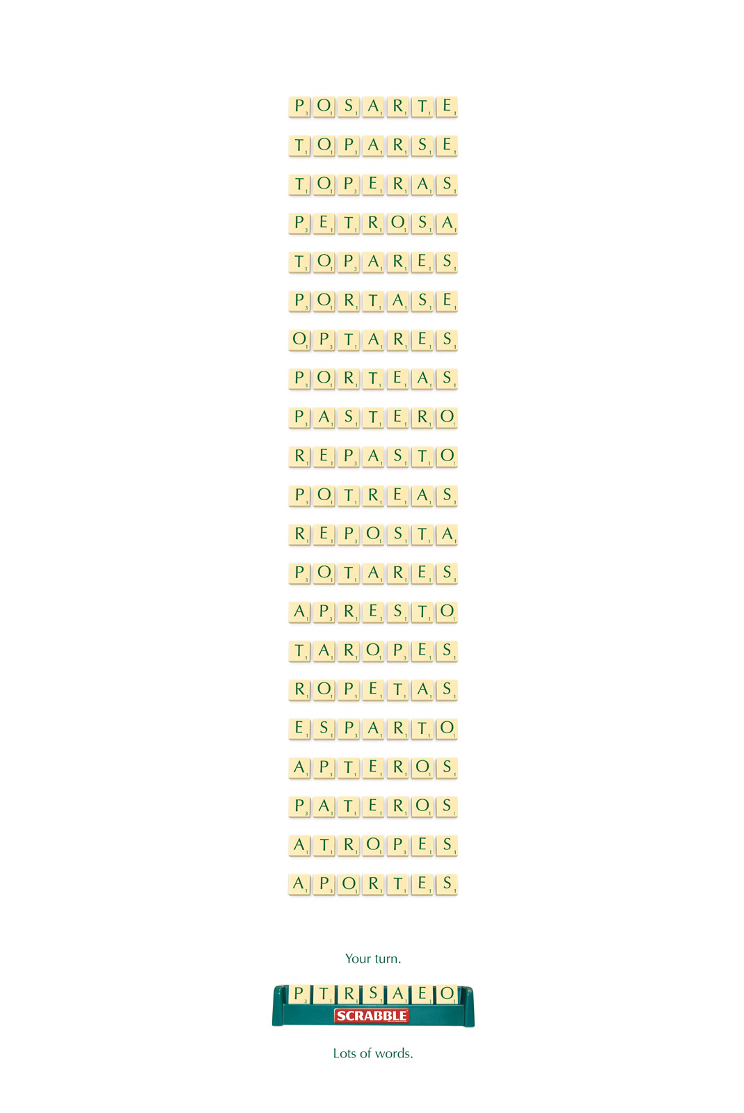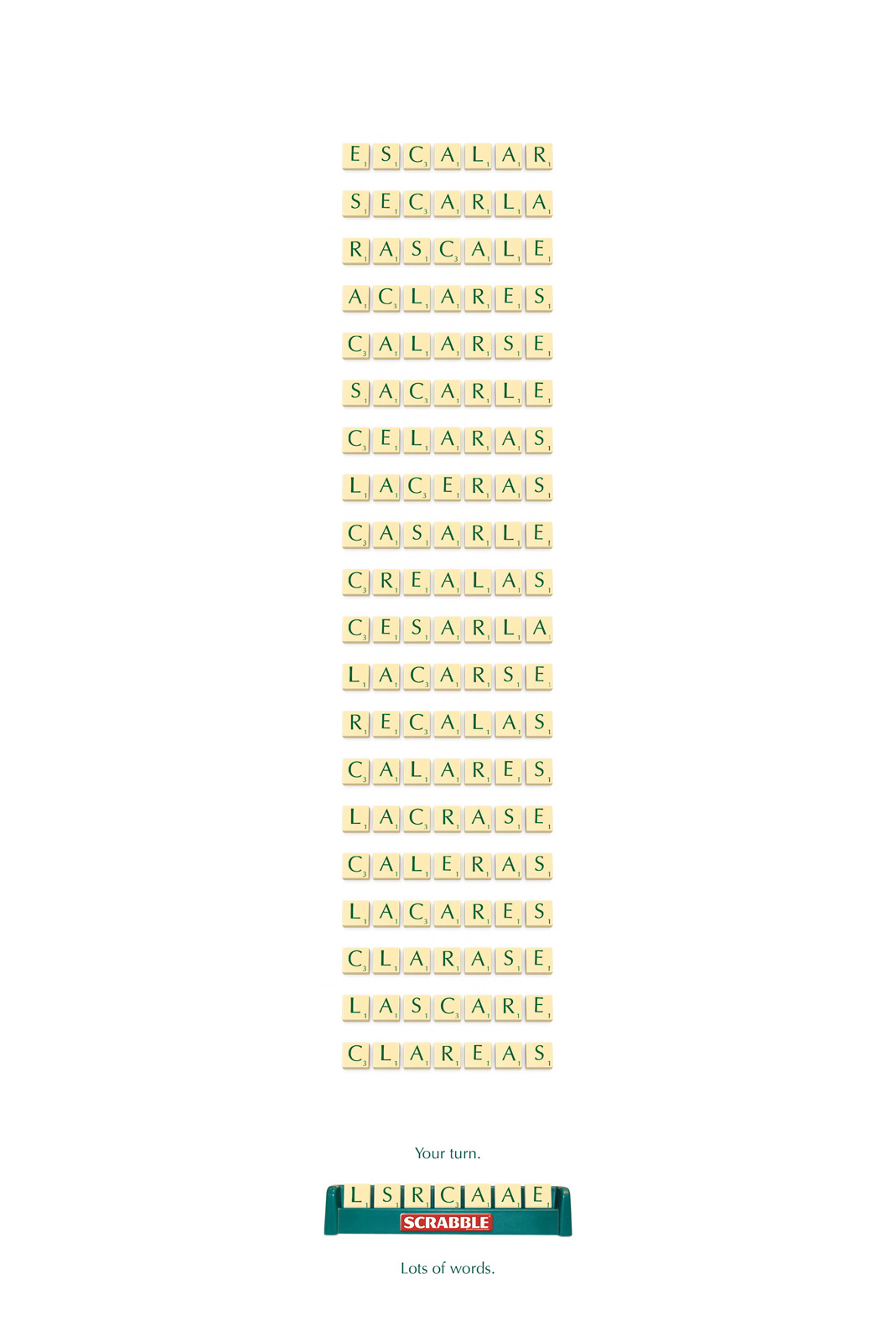Le Scrabble, c’est avant tout des lettres qui composent des mots. Belle idée de campagne d’affichage basée sur ce concept pour la marque Scrabble au Chili en 2008.