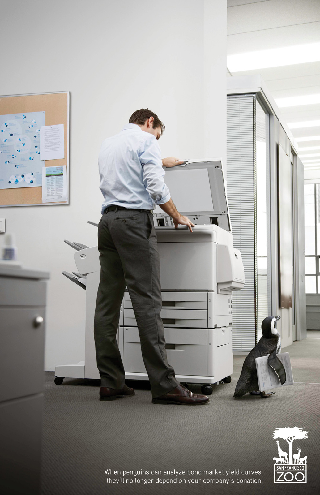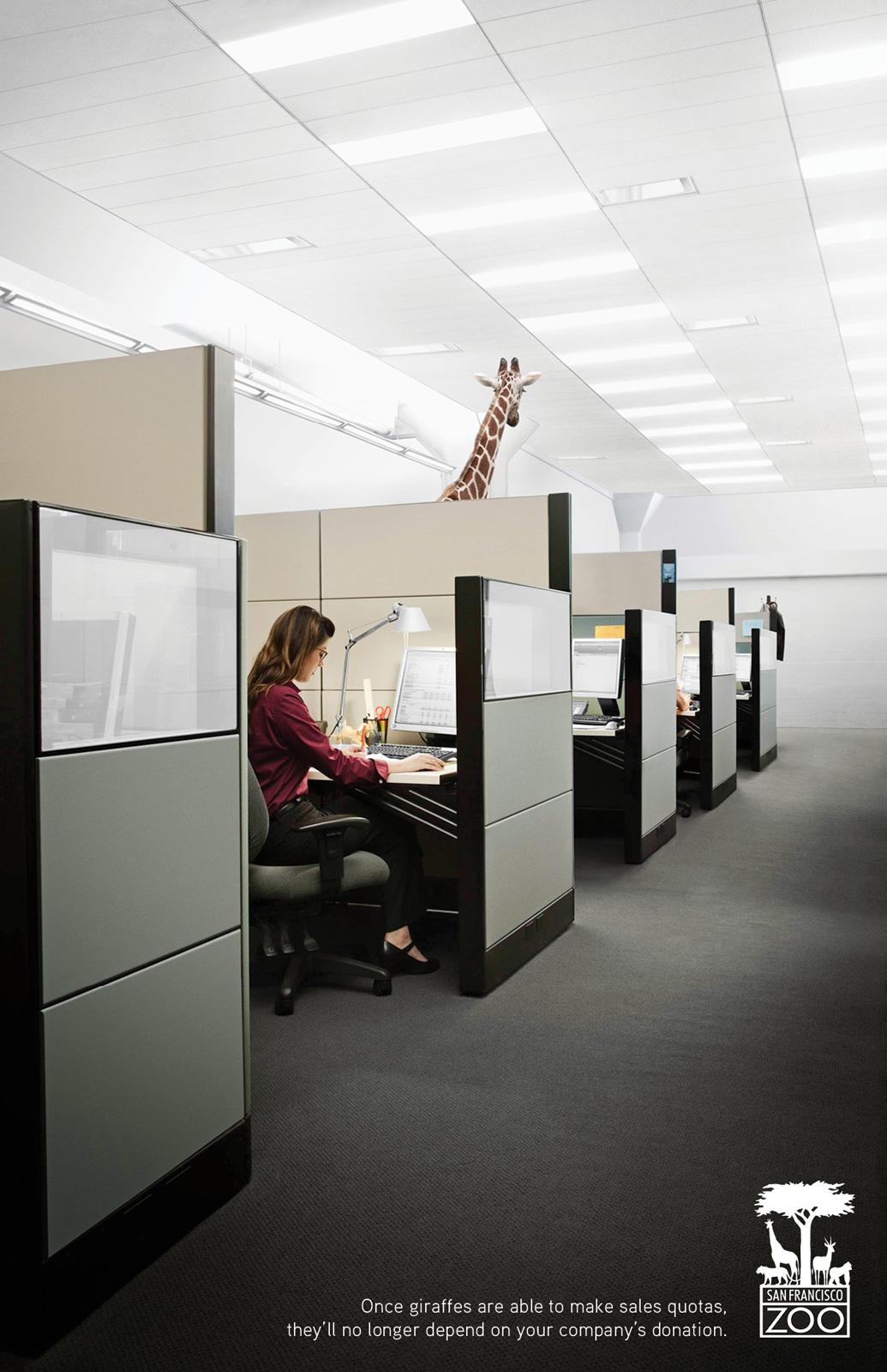 Très beau concept pour cette campagne presse destinée à inciter la cible à faire des dons au zoo de San Francisco. Il est vrai que les girafes, koalas et pingouins ne sont pas encore nos collègues de bureau….