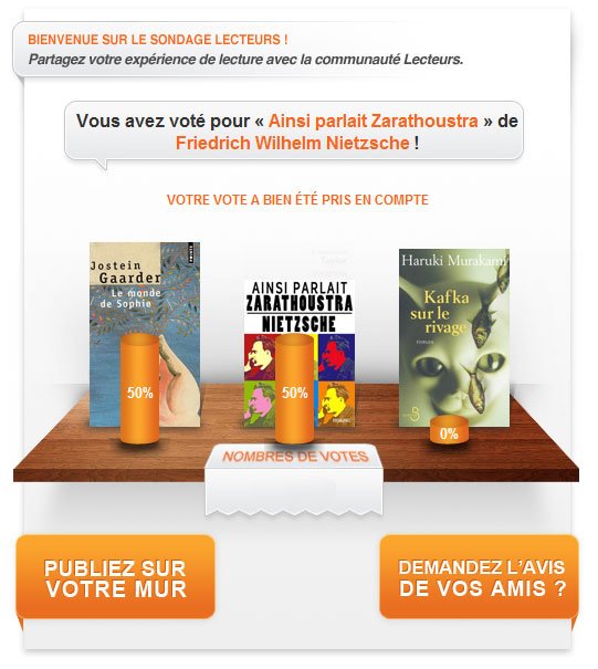 Chaque semaine, la Fanpage Lecteurs propose à ses fans de voter pour leurs lectures préférées parmi une série de 3 romans ou BD, et de partager leur sélection avec leur cercle d’amis. Les résultats de l’ouvrage ayant obtenu le plus de votes sont ensuite publiés, afin d’engager la discussion autour du choix des lecteurs, et ainsi confronter les idées de chacun.