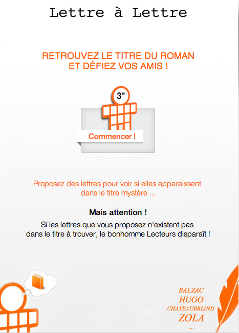 Disponible en permanence sur la Fanpage Lecteurs, l’onglet « Lettre à Lettre » reprend les règles du pendu. L’objectif : trouver en un temps limité le titre complet de l’ouvrage ou de la BD figurant parmi la collection du site Lecteurs, et tenter d’améliorer son score. Plus un joueur répond vite, plus il marque de points. En découvrant l’intitulé de l’ouvrage, le gagnant est invité à se rendre sur le site de Lecteurs pour télécharger sa version numérique, ou soumettre un avis, permettant ainsi de générer un trafic conséquent et qualifié vers le réseau social littéraire. Pour maximiser la viralité du jeu et mobiliser de nouveaux joueurs tout au long de l’année, les participants peuvent, par ailleurs, publier leurs scores sur Facebook ou défier leurs amis.