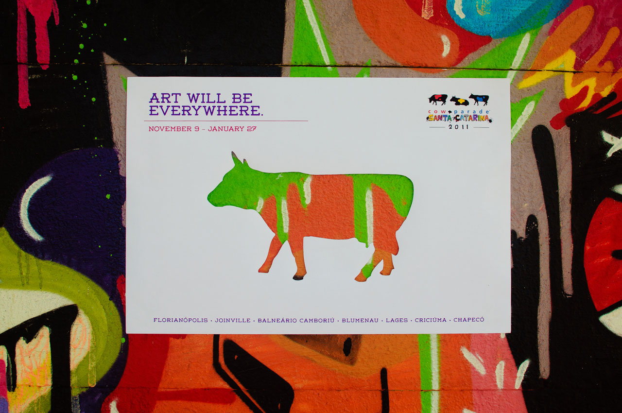 Une idée simple mais efficace pour promouvoir la Cow parade de Santa Catarina au Brésil : une affiche avec une découpe de vache placée sur des murs de street art. Et cela donne, une campagne d’affichage sauvage qui exprime la diversité de la Cow Parade grâce à la diversité de ses supports. Originale et très économique. L’art vache est partout, mais surtout dans la rue au Brésil.