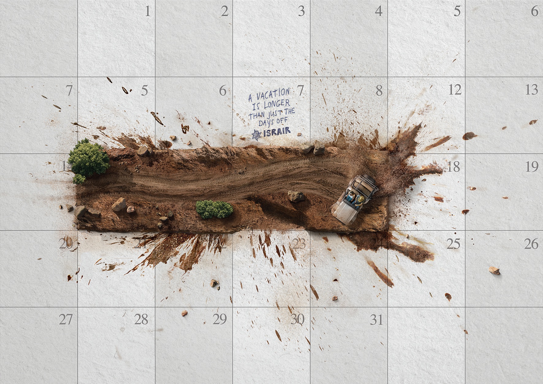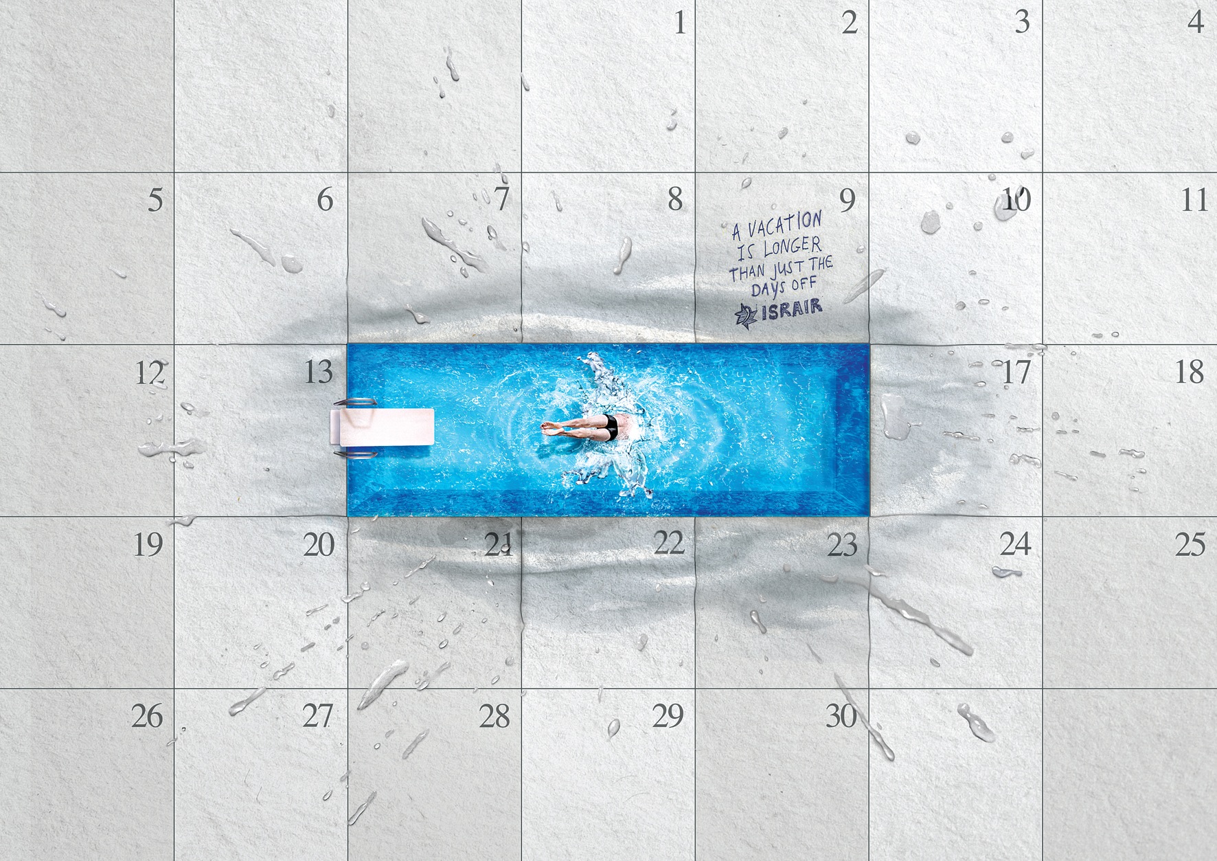 Belle campagne d’affichage pour Israir Travel Agency : en utilisant l’astuce du calendrier et du break de 3 jours avec des éclaboussures, on comprend rapidement que quelques jours de break sont bénéfiques au-delà des jours de vacances en question… Une campagne qui nous inspire chez JEM après avoir vécu le départ de nos clients pendant ces 15 jours de vacances scolaires. Vivement le break et ses bénéfices !