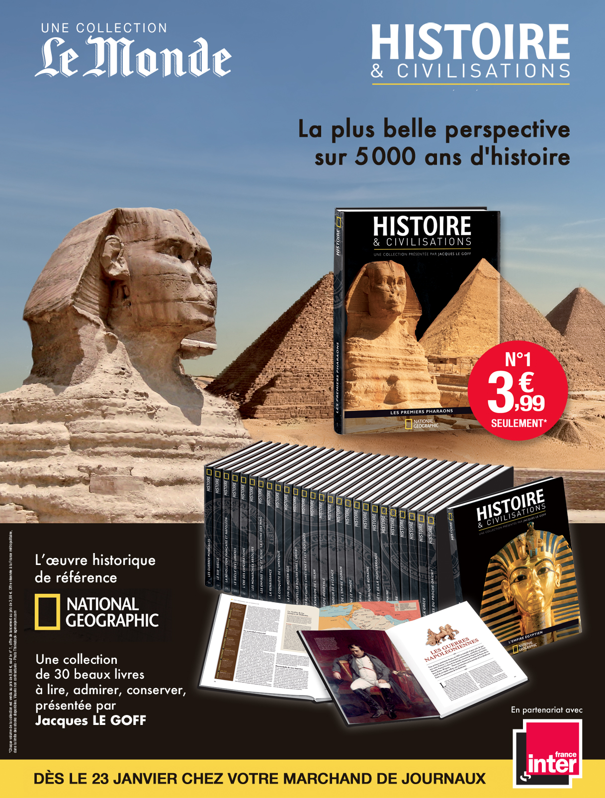 C’est Le lancement de la collection Le Monde Histoire & Civilisations qui vous offre cette belle perspective sur 5 000 ans d’histoire. Une collection National Geographic, parrainée par Jacques Le Goff, qui rassemble toute l’histoire de l’humanité en 30 volumes. Et le premier numéro, les premiers pharaons, est actuellement disponible chez votre marchand de journaux. Vous souhaitez en savoir plus ? Cliquez sur histoire-et-civilisations.fr.