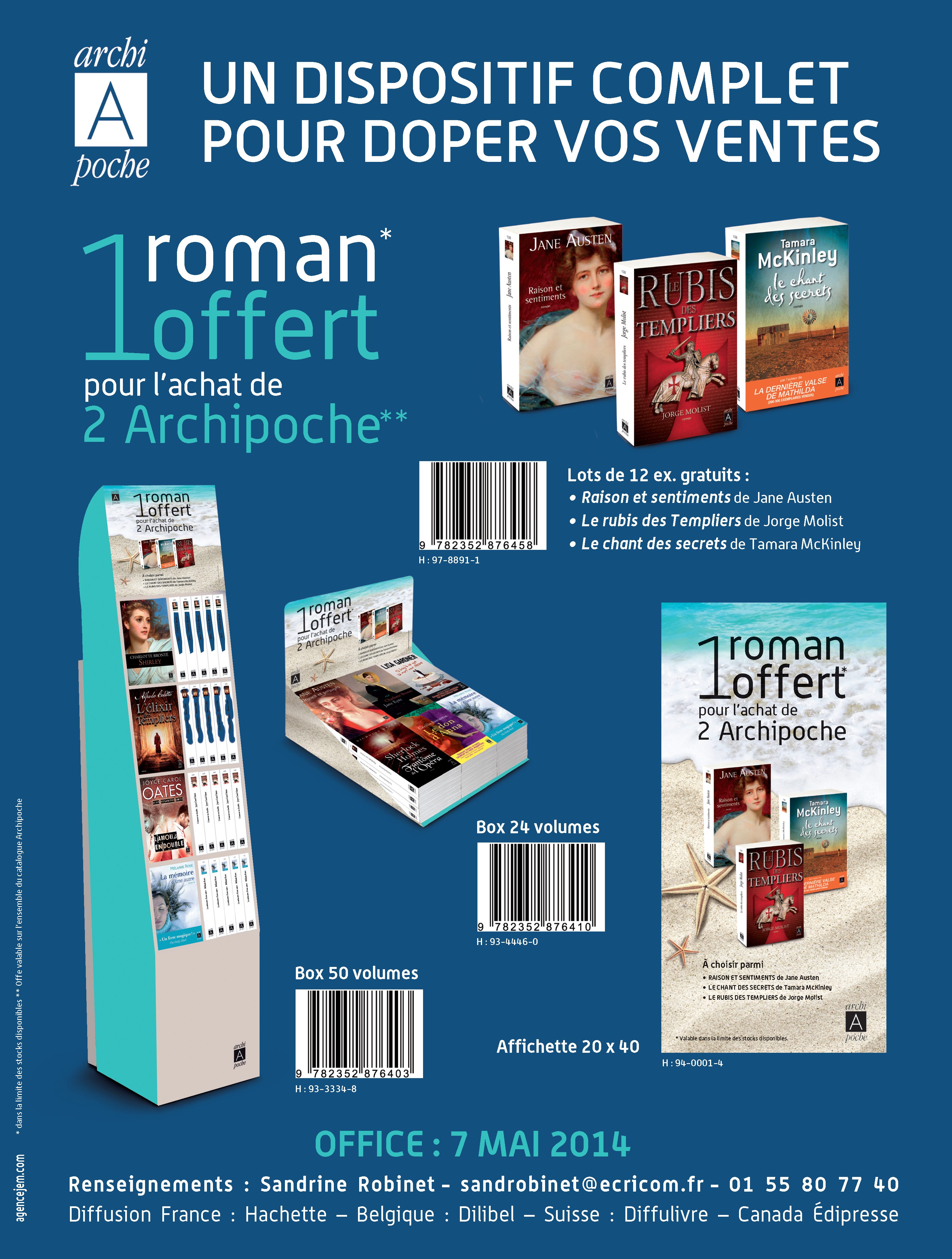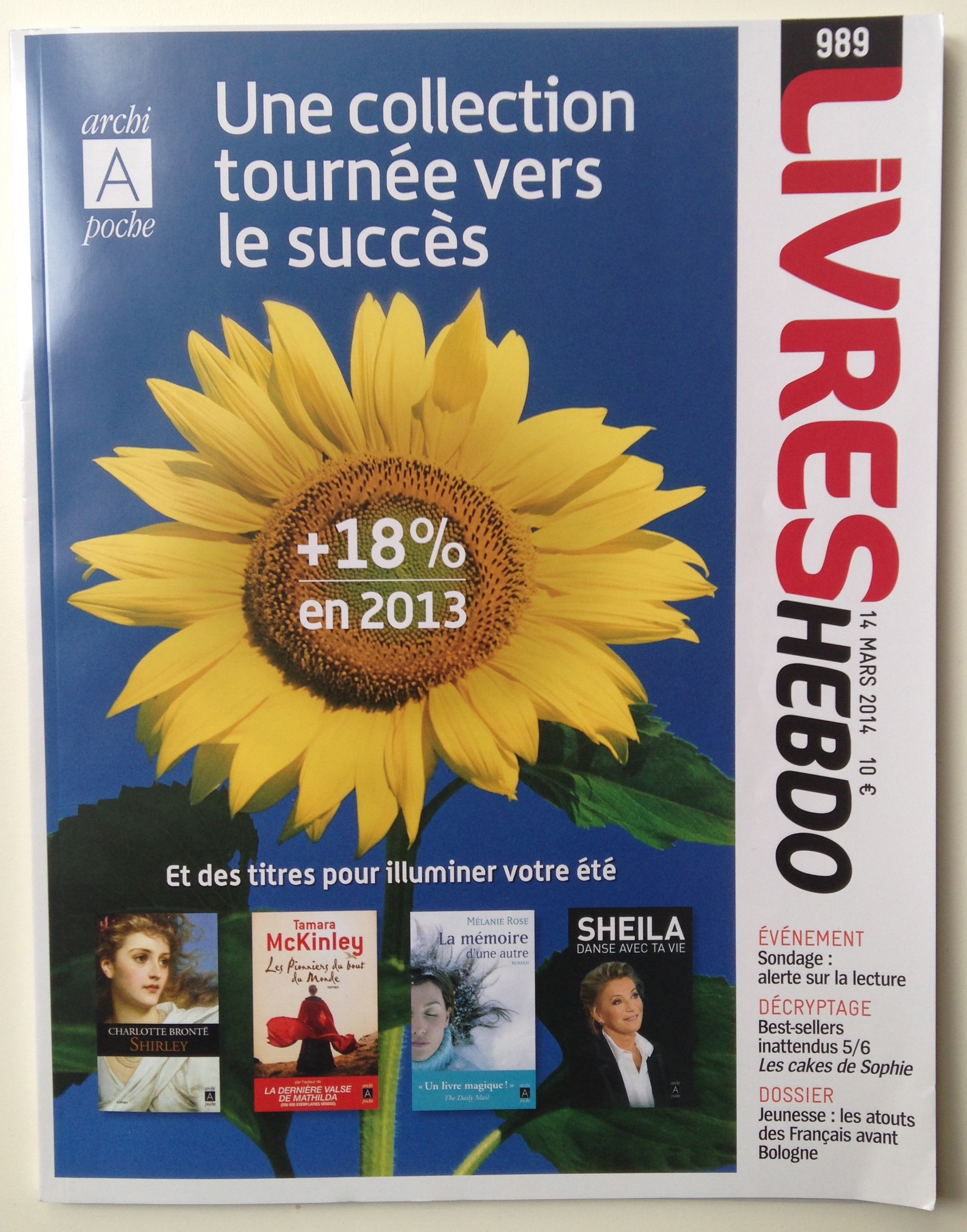 Les éditions Archipoche font la Une de Livres Hebdo cette semaine : une collection de poche qui continue à progresser d’année en année, et ce, malgré un marché difficile (-2,8% pour le marché du livre en 2013 selon Gfk). Une petite collection qui s’est donc se tourner vers le soleil, et qui illuminera encore votre été avec l’opération « 1 roman offert pour l’achat de 2 Archipoche ». Vivement l’été ! Une communication signée JEM.