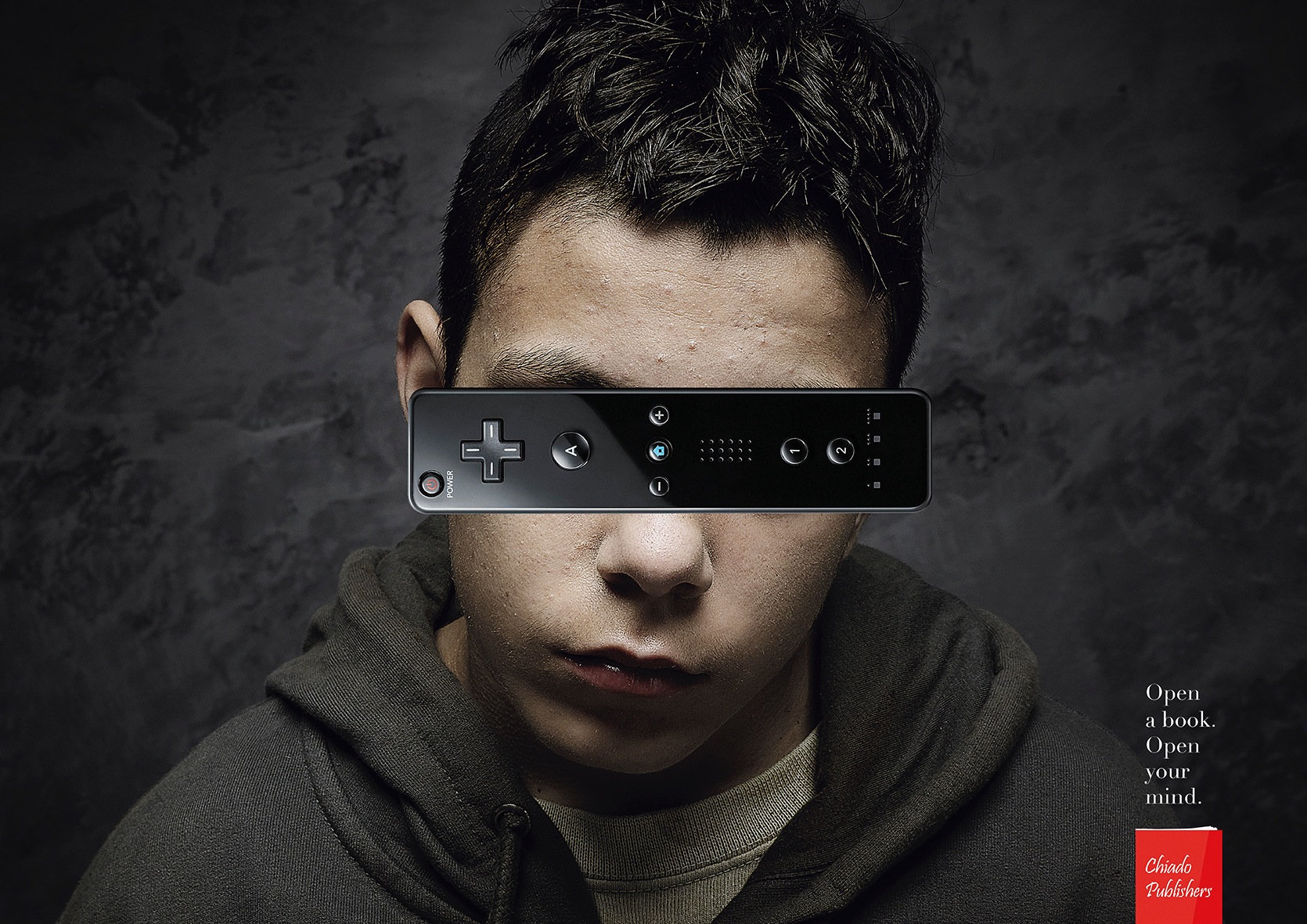 Dans le même esprit d’incitation à la lecture de livres, la campagne d’affichage portugaise pour Chiado Publishers « Open a book, open your mind » est très décevante. L’opposition télévision/game boy/smartphone et les livres est un grand classique qui paraît aujourd’hui totalement désuet. Pourquoi l’utilisation de l’un empêcherait-il le plaisir de l’autre ?