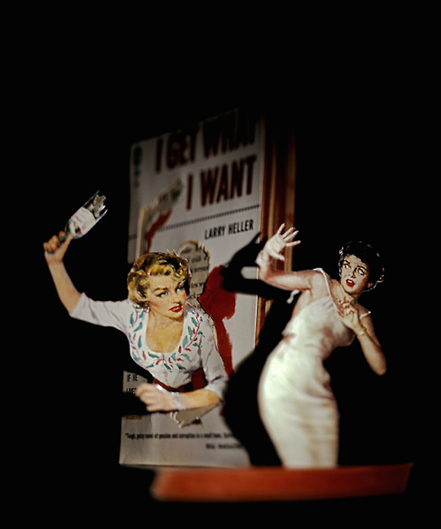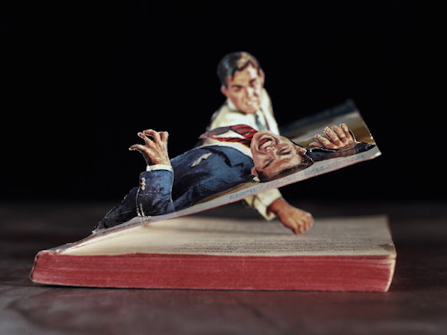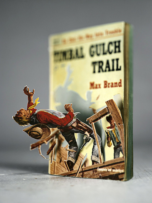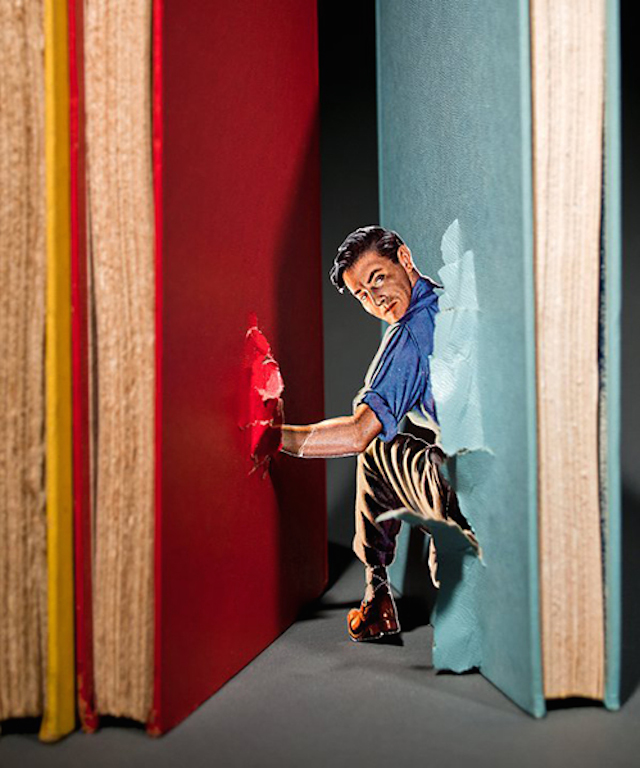 Mais voici un artiste, Thomas Allen, qui va plus loin et qui fait des collages et du paper art en 3D avec des illustrations de livres. Les personnages incarnés donnent du relief à la couverture et on a l’impression que ces figures en papier vivent leurs aventures sous les yeux des lecteurs. L’histoire prend vie !