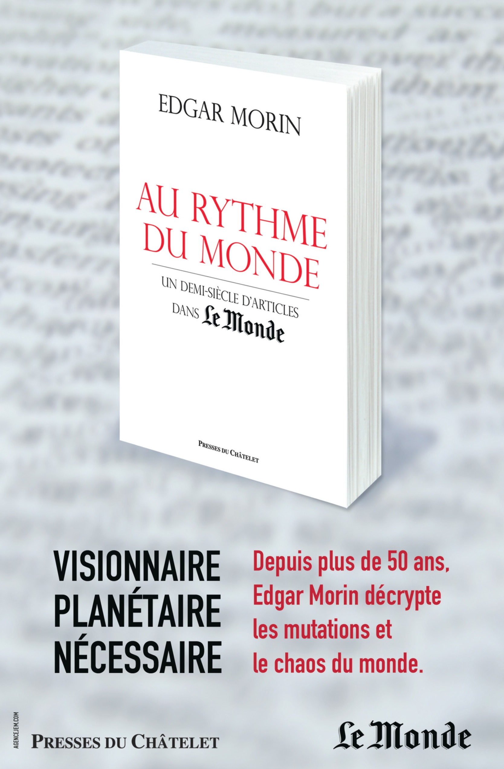 Pendant plus de 50 ans, Edgar Morin a publié des articles dans Le Monde qui décryptent le présent et tirent des lignes vers l’avenir. Il pose un regard ennemi de la « pensée simplifiante » : un souci de complexité qui confère à ses diagnostics un caractère visionnaire. Ces articles sont enfin publiés dans un livre, Au rythme du monde, aux éditions des Presses du Châtelet. Et à cette occasion, JEM a réalisé une campagne dans le quotidien Le Monde. Visionnaire, planétaire et nécessaire… 3 bonnes raisons de lire (ou relire) ces articles !