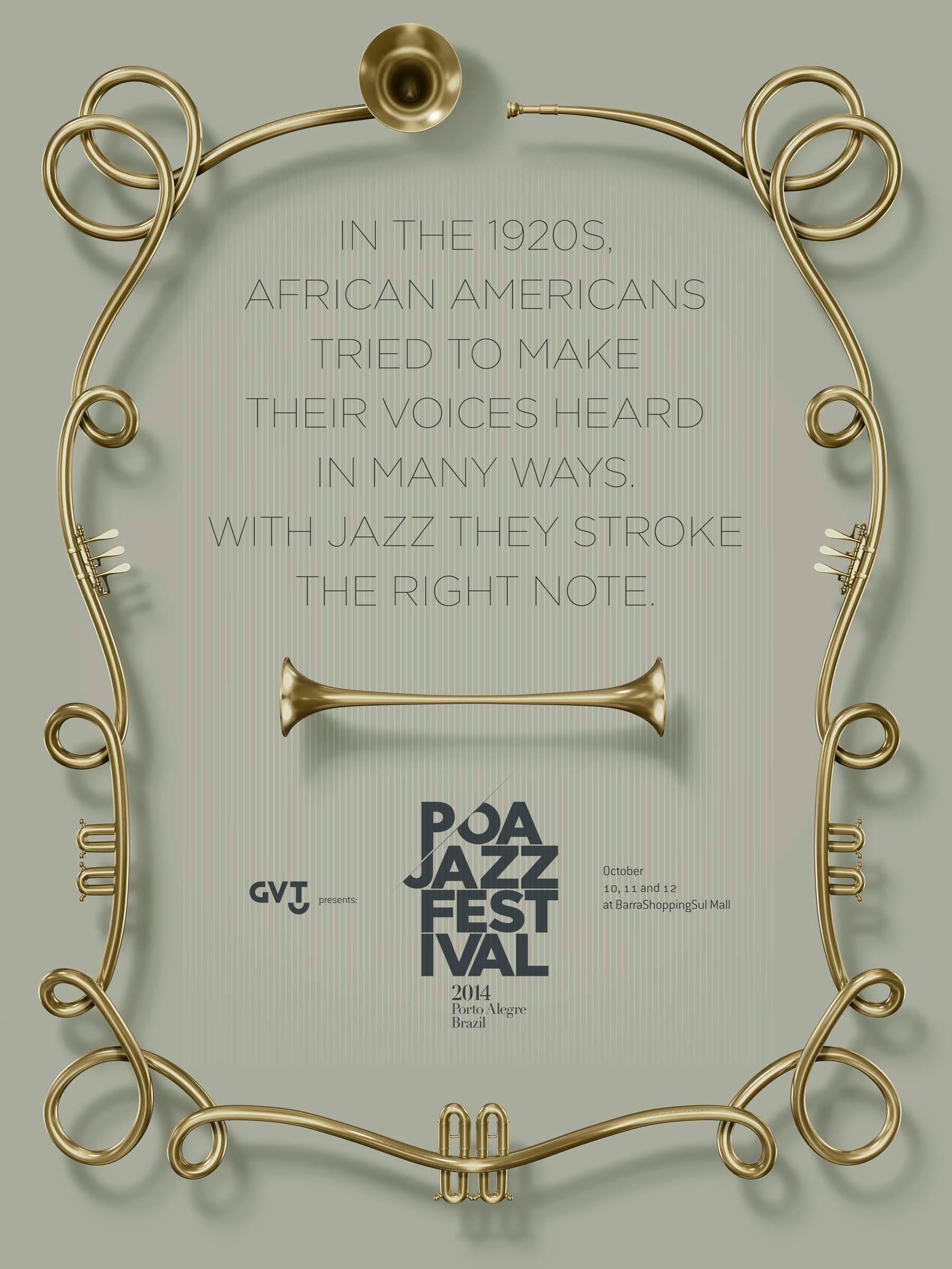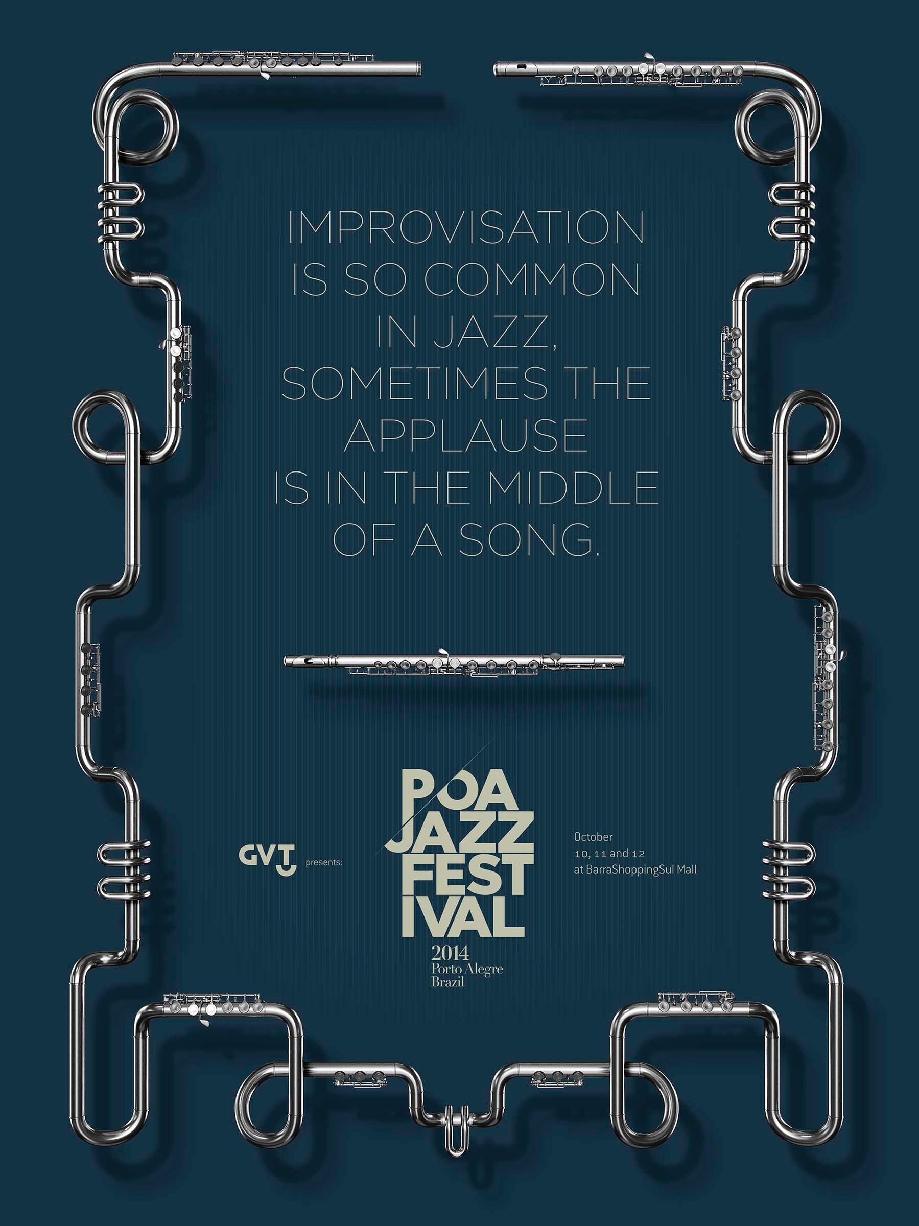 Belle campagne d’affichage pour le festival de jazz de Porto Alegre au Brésil, qui vient tout juste de se terminer. Une mise en valeur des particularités du jazz dans les mots et dans la mise en scène des instruments. On aime chez Jem !