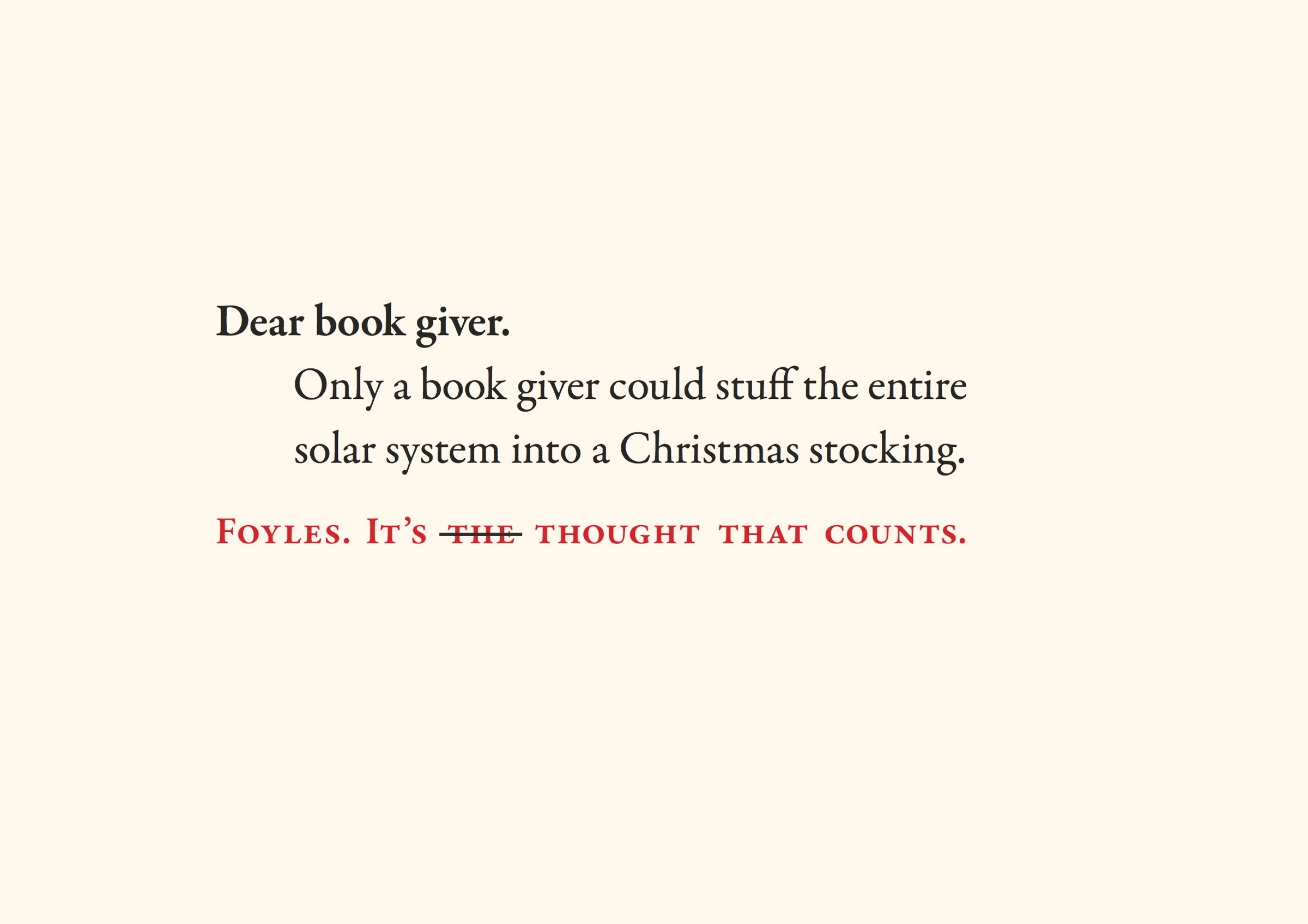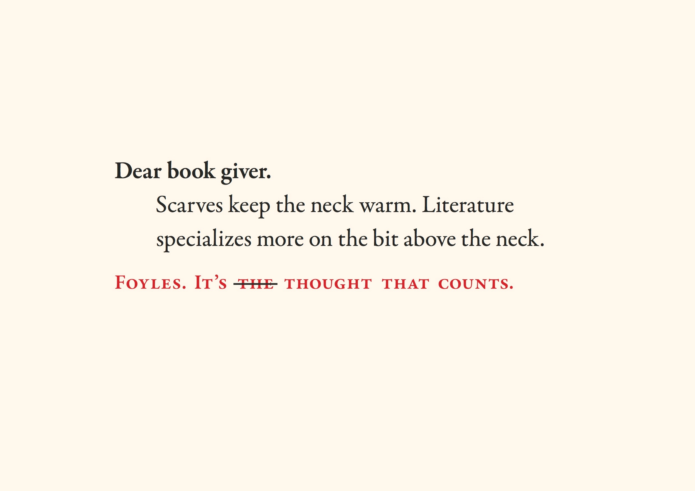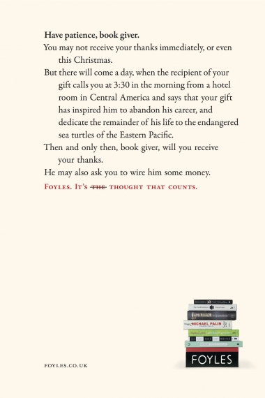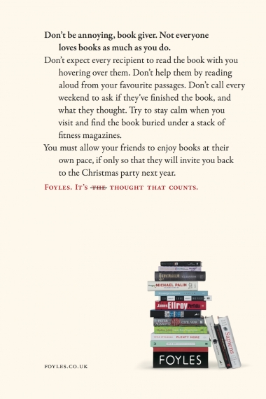 Bientôt Noël…. eh oui, la liste des cadeaux sera bientôt de circonstance ! Alors quoi de mieux que d’offrir des livres ? C’est l’esprit de la nouvelle campagne print de la librairie Foyles à Londres. Une campagne entièrement typo qui remercie les personnes qui vont offrir un livre à Noël… plutôt qu’une écharpe ou un pudding. Attention, humour très british !