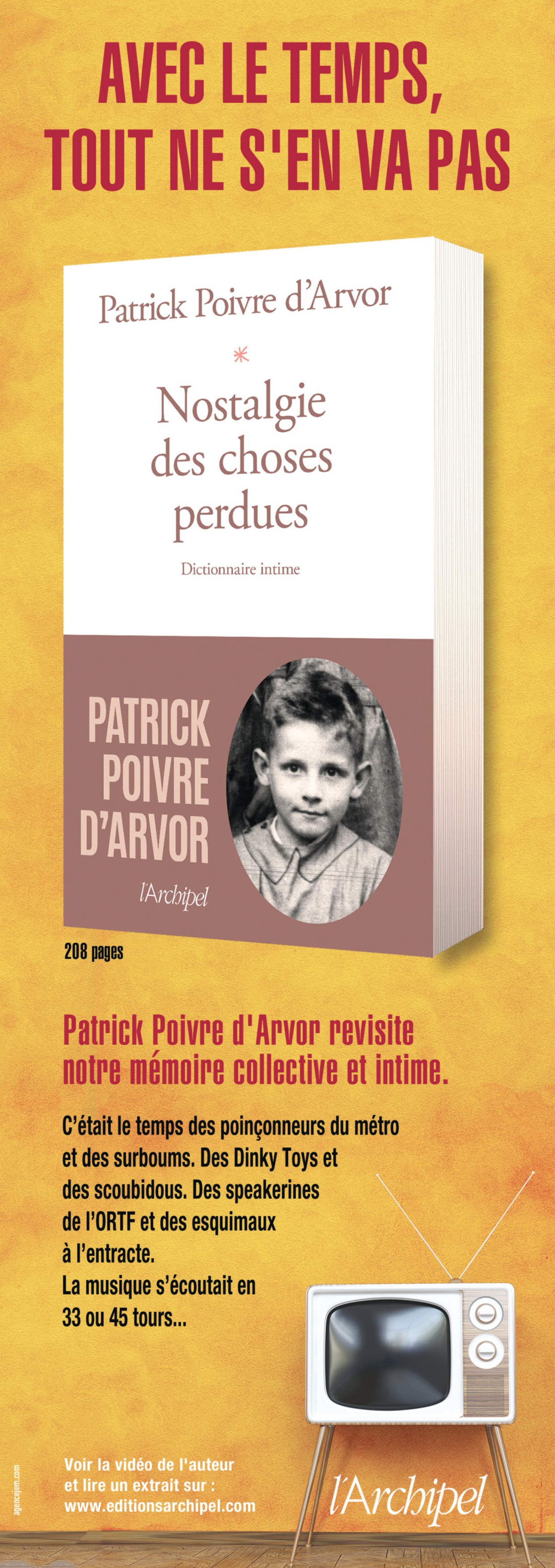 C’était avant : les hommes roulaient en DS, les femmes portaient des mini-jupes dessinées par Mary Quant. Dans les transports, on donnait son ticket à un poinçonneur. La musique s’écoutait sur 45 ou 33 tours. Il ne sait pas si c’était mieux ou pas, mais c’était avant et ça lui plaît. Il, c’est Patrick Poivre d’Arvor. Il revient en librairie avec Nostalgie des choses perdues, aux éditions de l’Archipel. Retour sur toutes les choses perdues parce qu’avec le temps, tout ne s’en va pas ! Une campagne presse et radio, signée JEM.