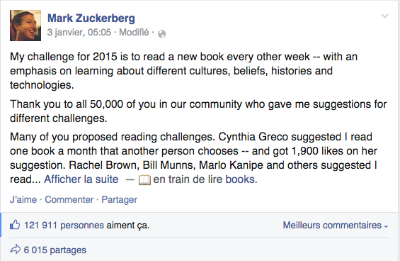 Il faut bien commencer l’année… avec de bonnes résolutions. Et 2015 commence par celle de Mark Zuckerberg : lire un livre toutes les 2 semaines ! Donc, le message est clair : en 2015, passez moins de temps sur Facebook… et lisez davantage.