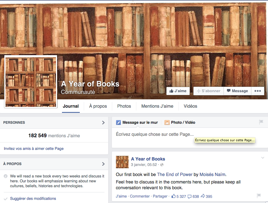 Pour prouver son engagement, Mark Zuckerberg a lancé une fanpage A Year of Books. Lancée le 3 janvier avec une première suggestion The End of Power de Moisés Naím, le succès est réel puisque le livre en question est d’ores et déjà en rupture de stock chez Amazon, le plus grand vendeur de livres aux Etats-Unis. En 2 jours, le titre a atteint la 8e position du classement des meilleures ventes d’Amazon.com. Et ce n’est qu’un début… Malheureusement, à ma connaissance, aucun éditeur français ne publie cet auteur !