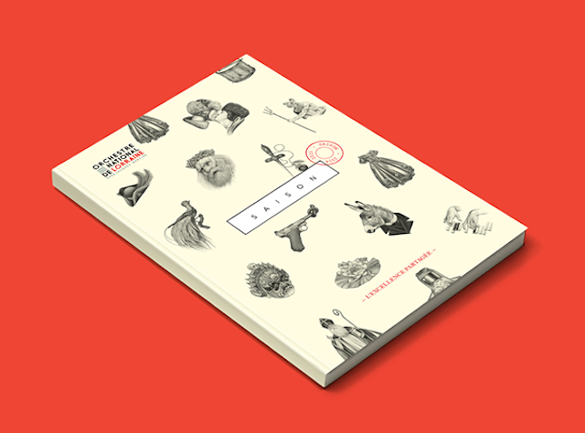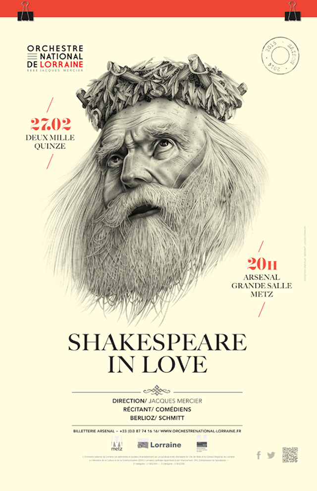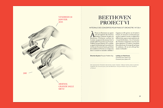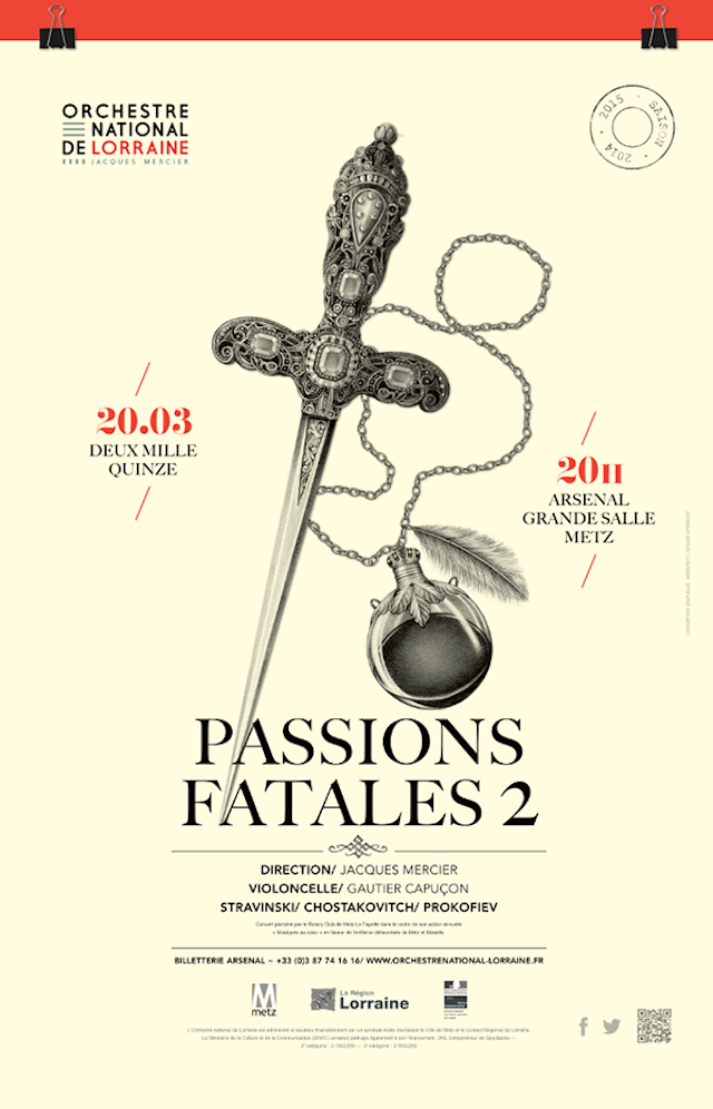 Belle campagne pour l’Orchestre National de Lorraine. L’ensemble de la programmation est illustré par des images symboliques – au crayon sur papier Canson : un couple russe qui s’embrasse pour Bons Baisers de Russie, un masque maléfique pour Malédiction,.. Et le tout est réuni dans un programme 2014/15 qui n’éveille pas que la vue… mais donne réellement envie de stimuler notre ouïe. Et ce grâce au talent des illustrateurs Violaine et Jérémy.