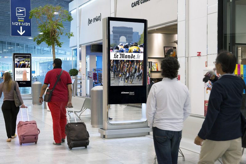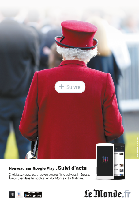 Après La Matinale, le Monde innove encore en lançant un nouveau service : le Suivi d’actu. Accro au Tour de France ? Concerné par la crise de la Grèce ? Il est possible désormais de suivre les infos qui vous concernent. C’est simple, il suffit de cliquer sur le bouton Suivre d’un article et tous les articles concernant ce sujet sont répertoriés. Un outil indispensable pour suivre l’actu tout l’été. Une campagne d’affichage numérique dans les aéroports de Paris, signée Jem.