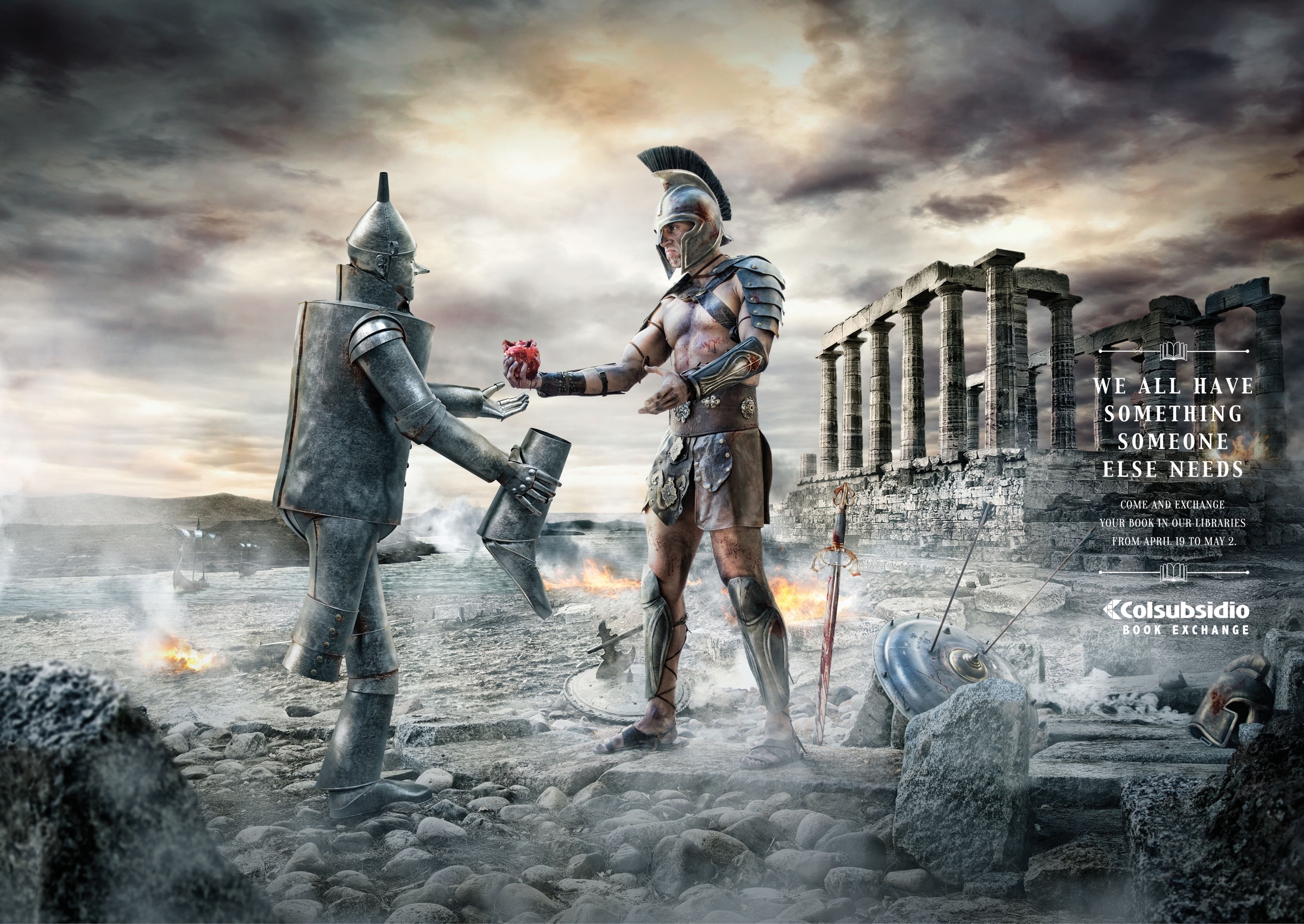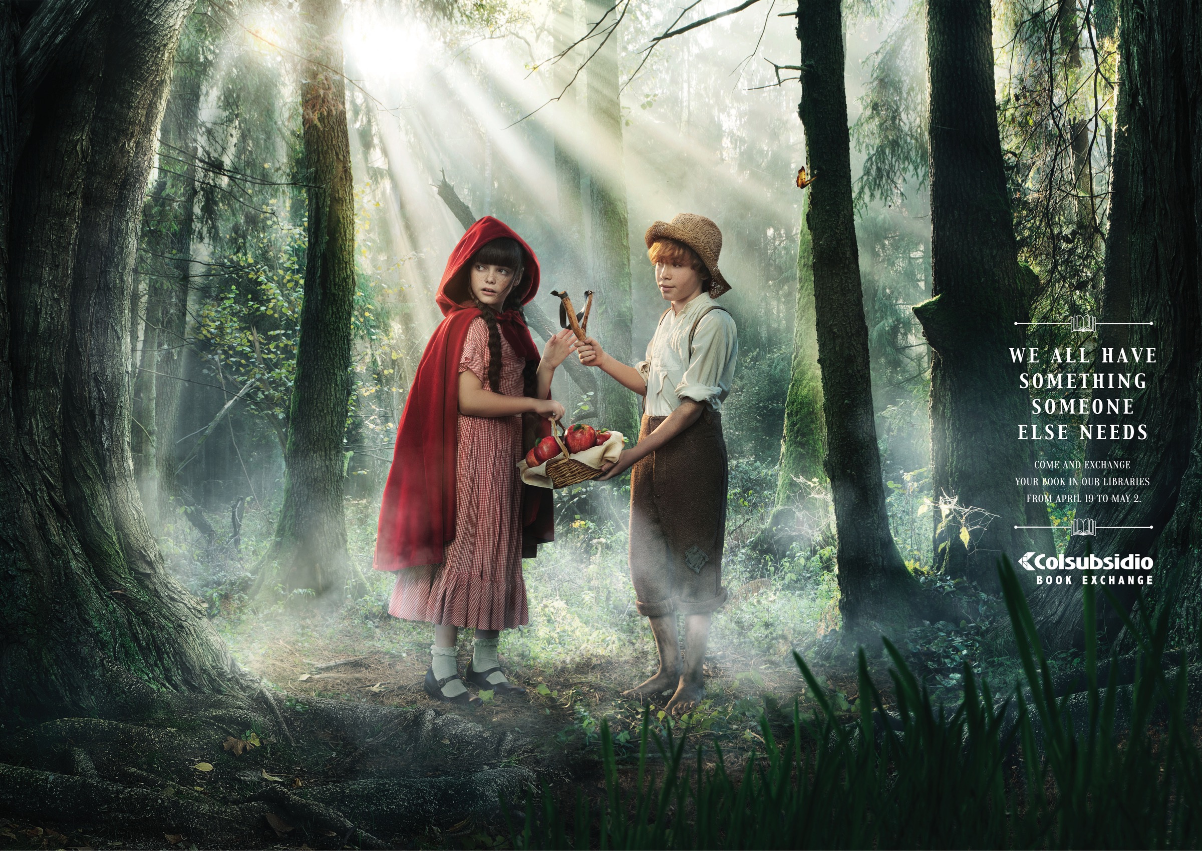 On vous avez d’ores et déjà parlé de Colsubsidio Book Exchange (Colsubsidio est un organisme colombien à but non lucratif qui fait partie du système de protection et de sécurité sociale) en 2012 avec leur très belle campagne print à voir et à revoir (lire échangeons nos histoires). En 2016, ils sont de retour avec un nouvel insight : on a tous quelque chose qui peut être utile à quelqu’un d’autre. Et place à l’imagination : quelle serait l’histoire si le Joueur de Flûte échangeait sa flûte contre un sac de pièces d’or avec le Chat Botté ou le Petit Chaperon rouge ses pommes avec le lance-pierre de Tom Sawyer ? Belle campagne print qui laisse place à l’imagination… pour promouvoir l’échange de livres.