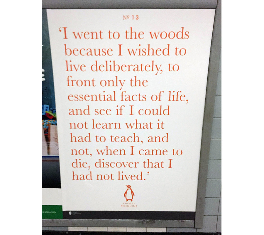 Redonner goût aux classiques… ce n’est pas toujours évident. La collection Pocket Penguins a récemment lancé une campagne d’affichage dans le métro londonien pour promouvoir la collection : une campagne typo utilisant des citations de 4 des 20 titres proposés. La particularité de la campagne, c’est qu’elle ne cite pas les auteurs et les titres des livres mis en scène et ne montre aucun livre. Seul le logo Pocket Penguins nous donne une indication afin d’inciter à la curiosité. Une curiosité sans polémique pour les citations de D.H. Lawrence et de Henry David Thoreau…