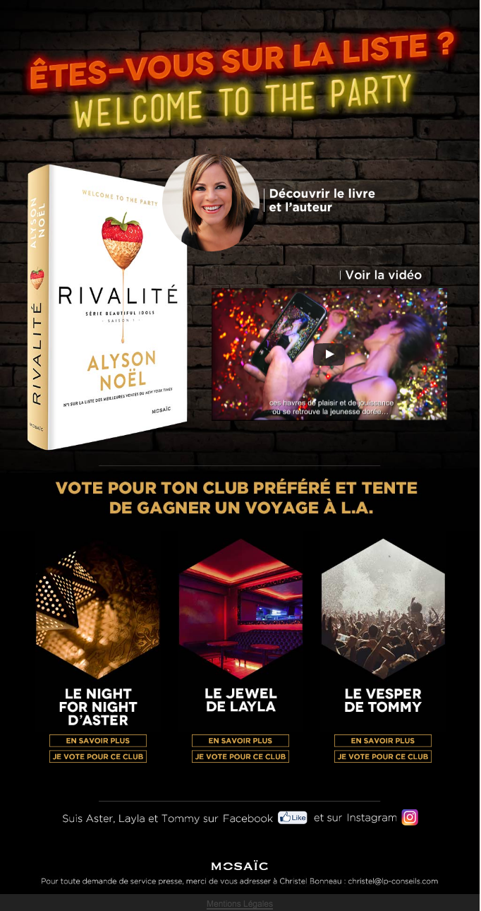 Alyson Noël, l’auteur à succès des Eternels, est de retour cet été avec Rivalité, un roman publié aux éditions Mosaïc. Bienvenue à L.A., dans le monde du glamour et des dance floor ! Une rivalité sans limite entre 3 protagonistes Layla, Aster et Tommy, commence… pour devenir la nouvelle star du clubbing. Rêve ou cauchemar ? Méfiez-vous : entre V.I.P et R.I.P, il n’y a qu’un pas.