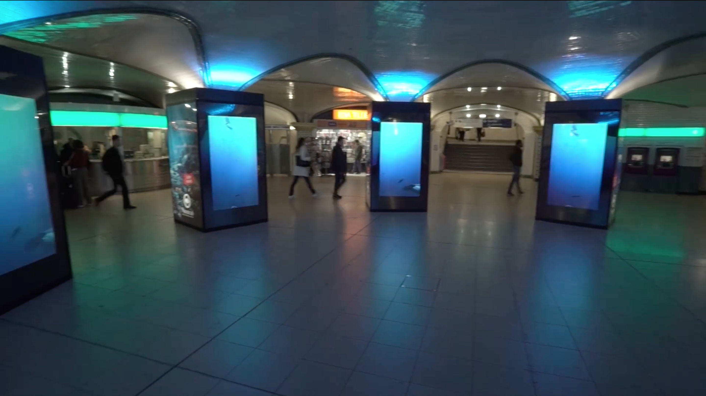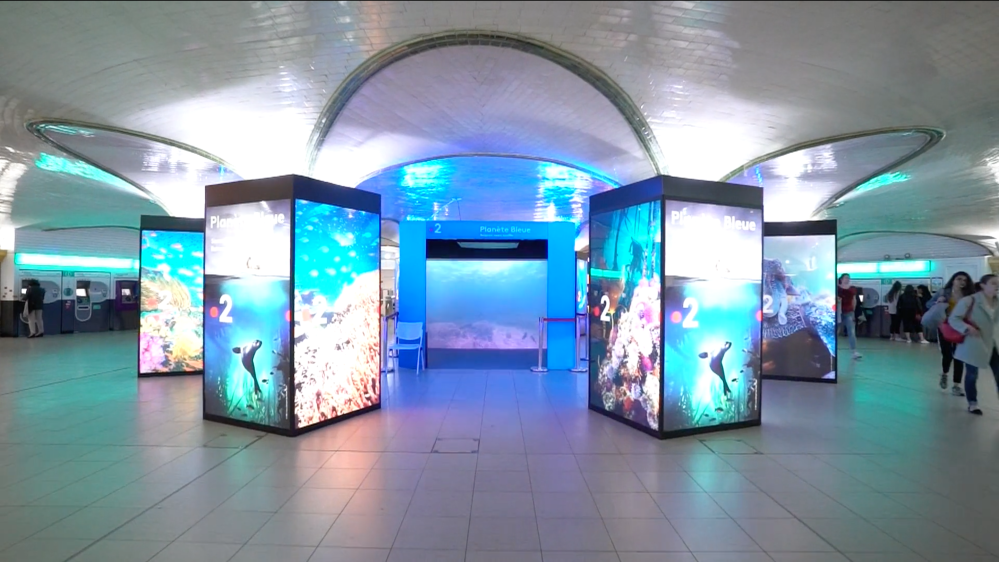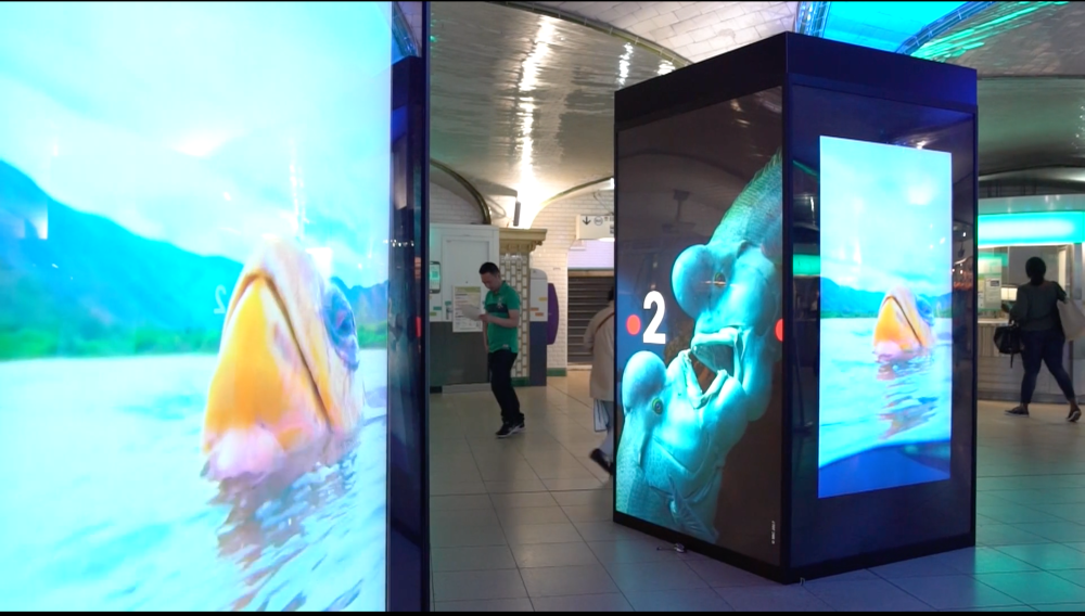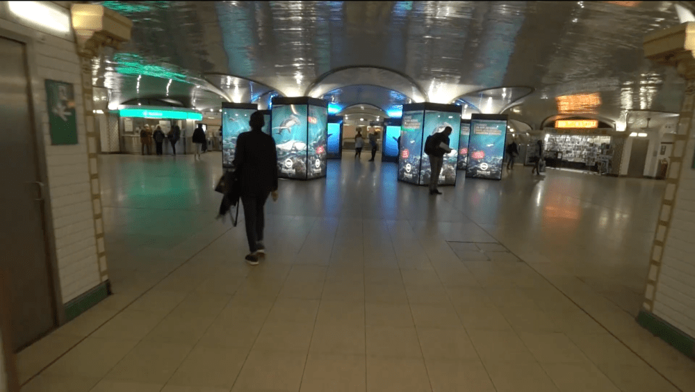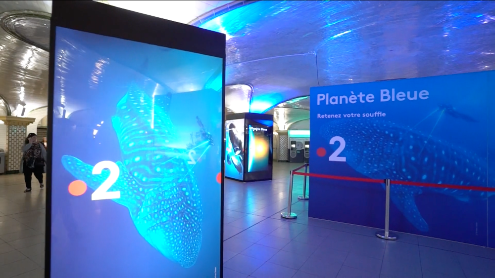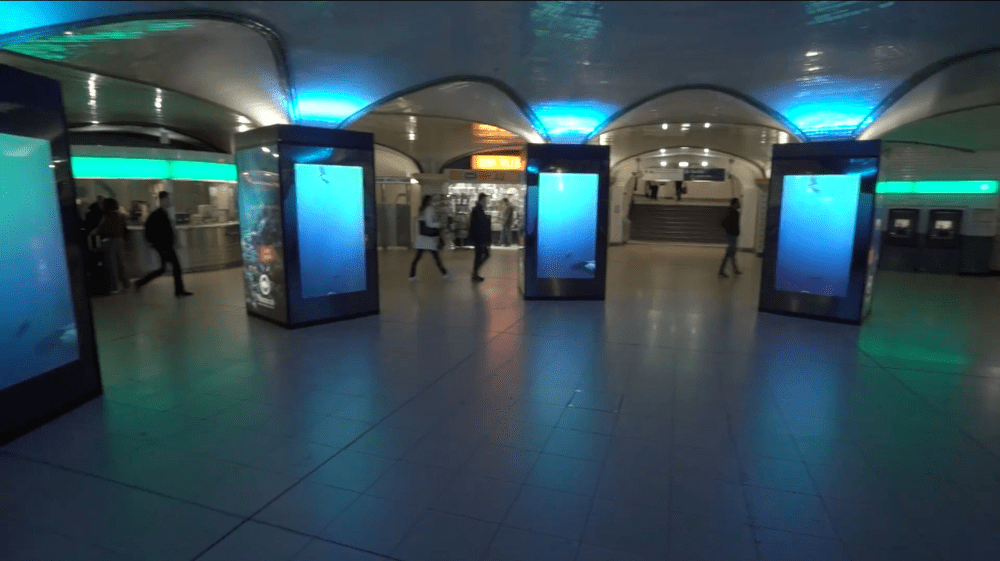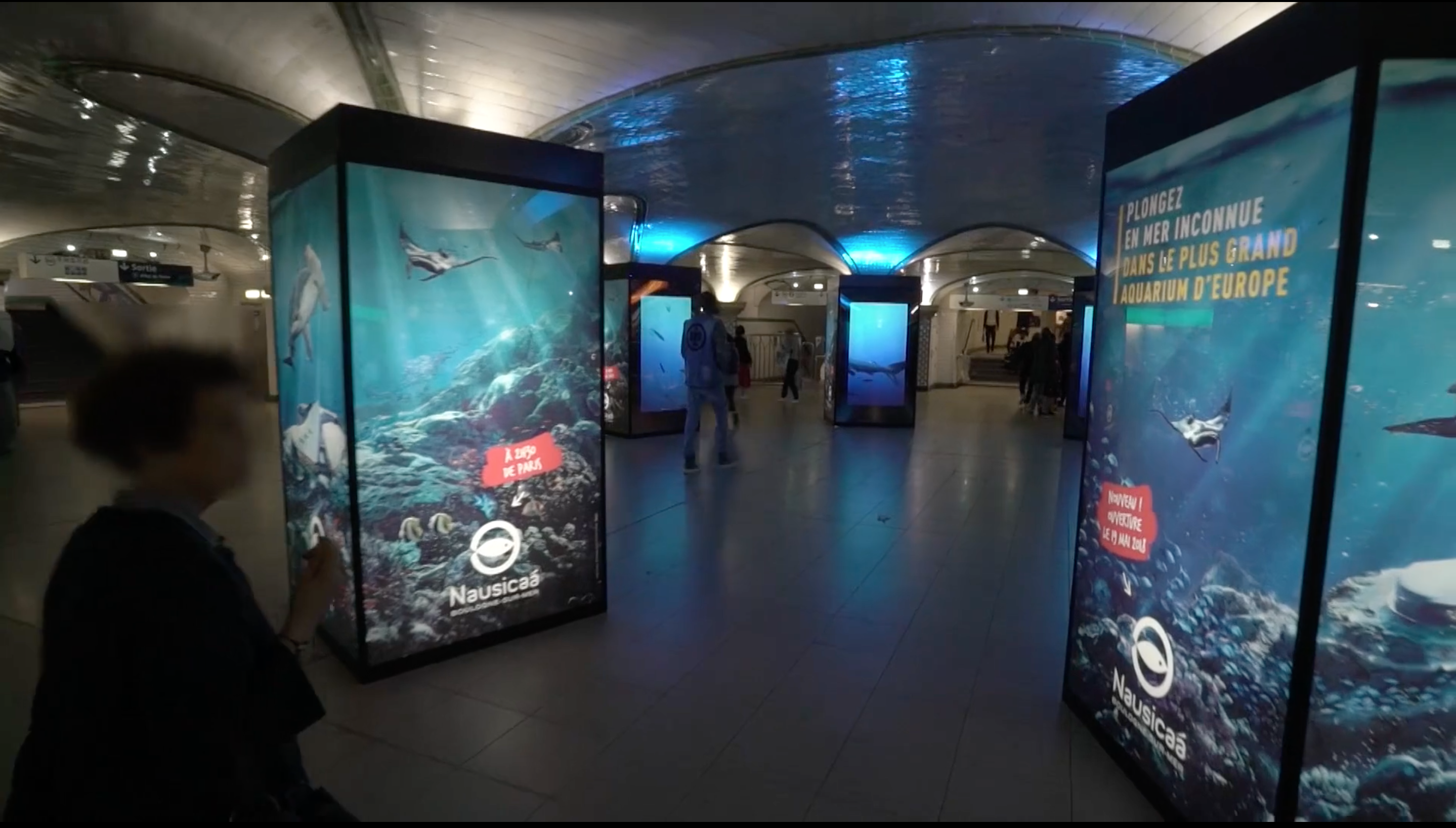 En mai, à l’occasion de l’ouverture de Nausicaä – centre national de la mer à Boulogne, nous avons déjà eu un avant-goût iodé à la gare Saint-Lazare, en habillant la Salle des Piliers avec le dispositif DigiPrivat de Mediatransport (8 piliers, 28 faces rétroéclairées et 4 écrans digitaux). Voir la vidéo : https://vimeo.com/272919644