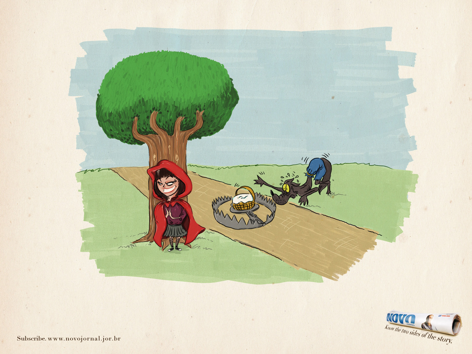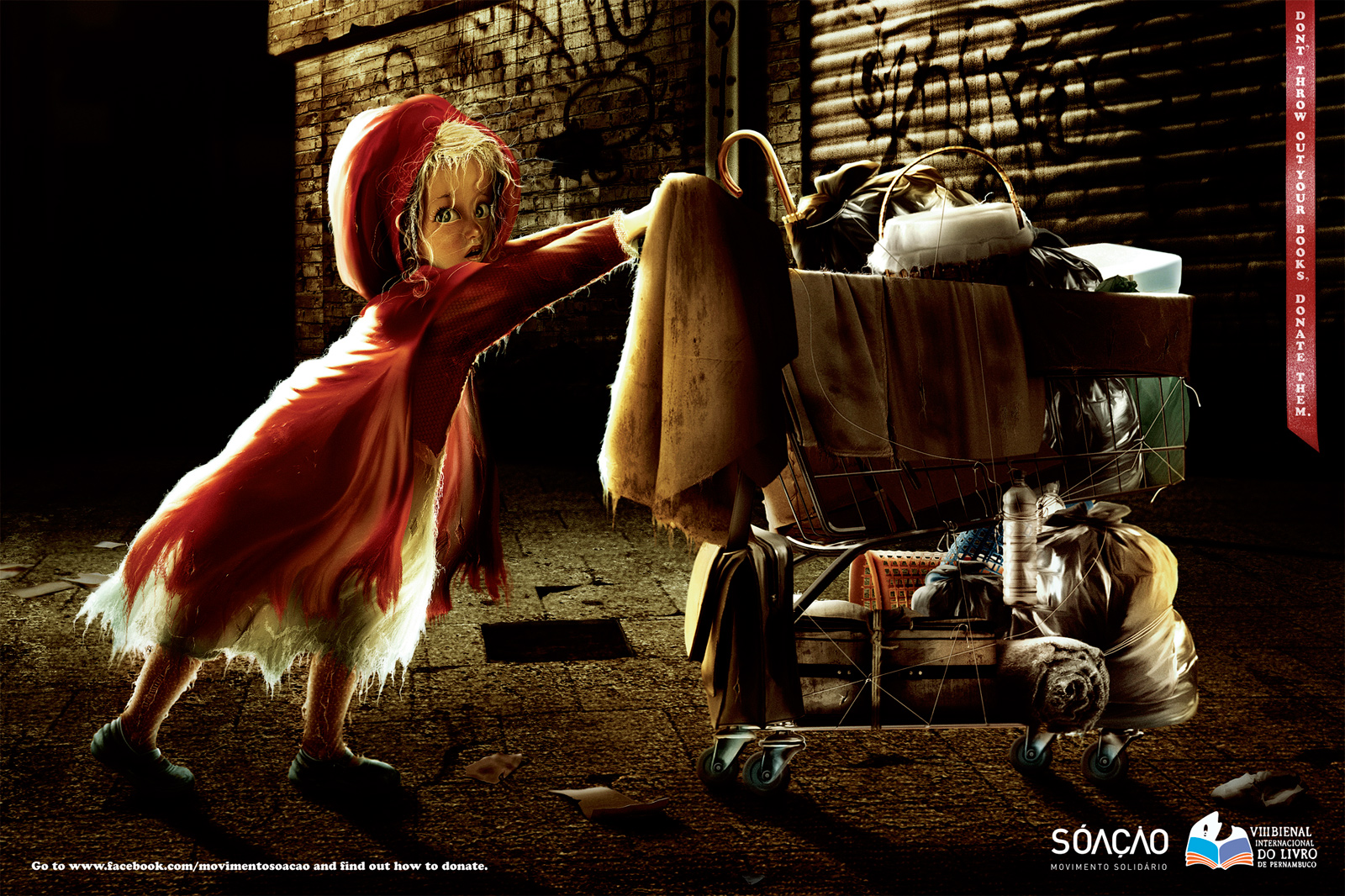 L’association SÓ AÇÃO au Brésil n’hésite pas à transformer notre petit Chaperon rouge en clochard pour promouvoir la donation de livres (campagne février 2012 – agence Paz)